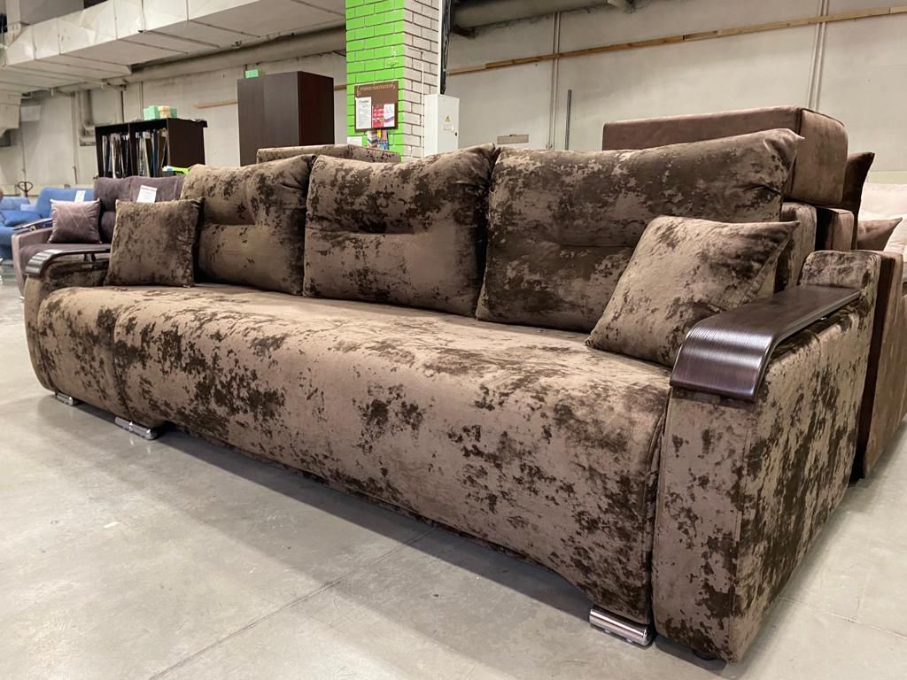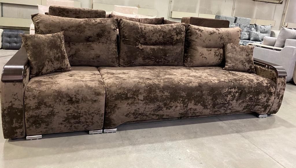 Взаимозаменяемый угол-трансформер, большое спальное место, короб под белье. Механизм трансформации позволяет раскладывать диван, не повреждая поверхности пола. Различная комбинация тканей, количество подушек по желанию клиента.
