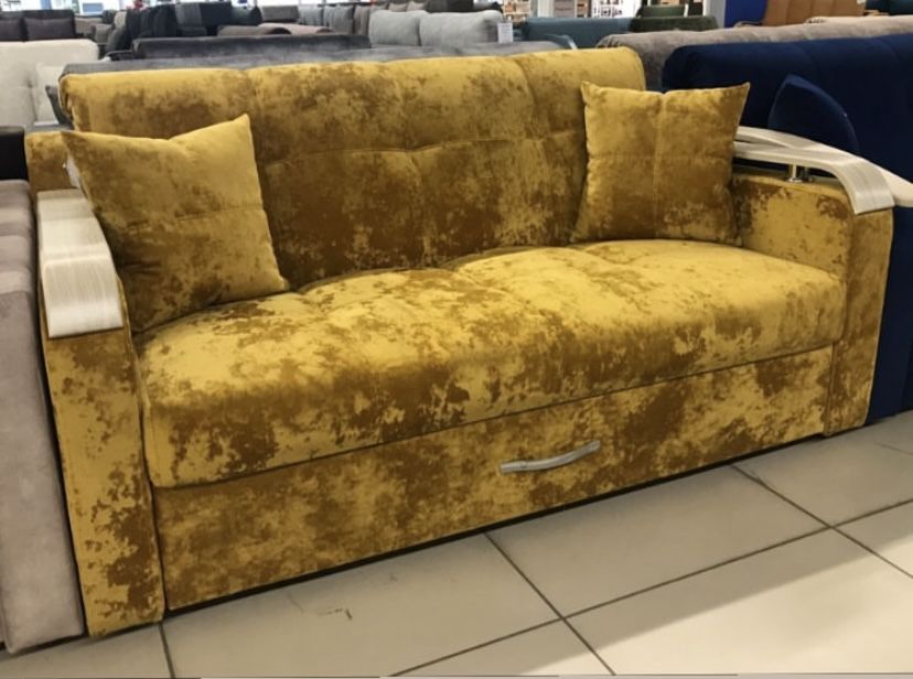 Большое ровное спальное место, единый матрац. Наполнение матраца: пенополиуретан. Диван легкий в трансформации. Цельный металлокаркас, березовые латы с ортопедическим эффектом. Ламинированный короб под белье.