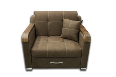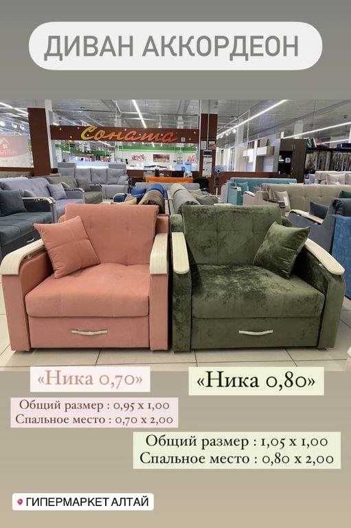 Компактный диван-кресло. Ровное спальное место, единый матрас. Наполнение матраса: пенополиуретан. Диван легкий в трансформации. Цельный металлокаркас, березовые латы с ортопедическим эффектом.