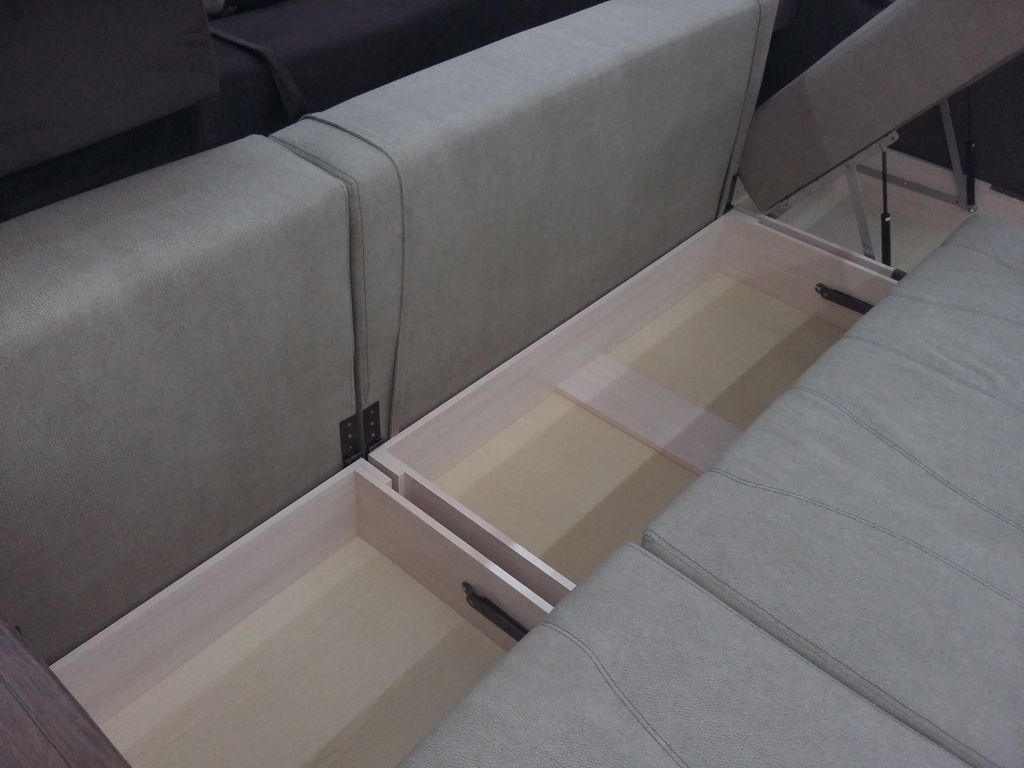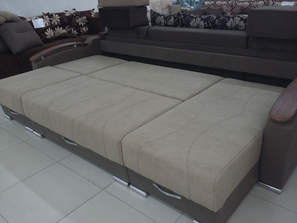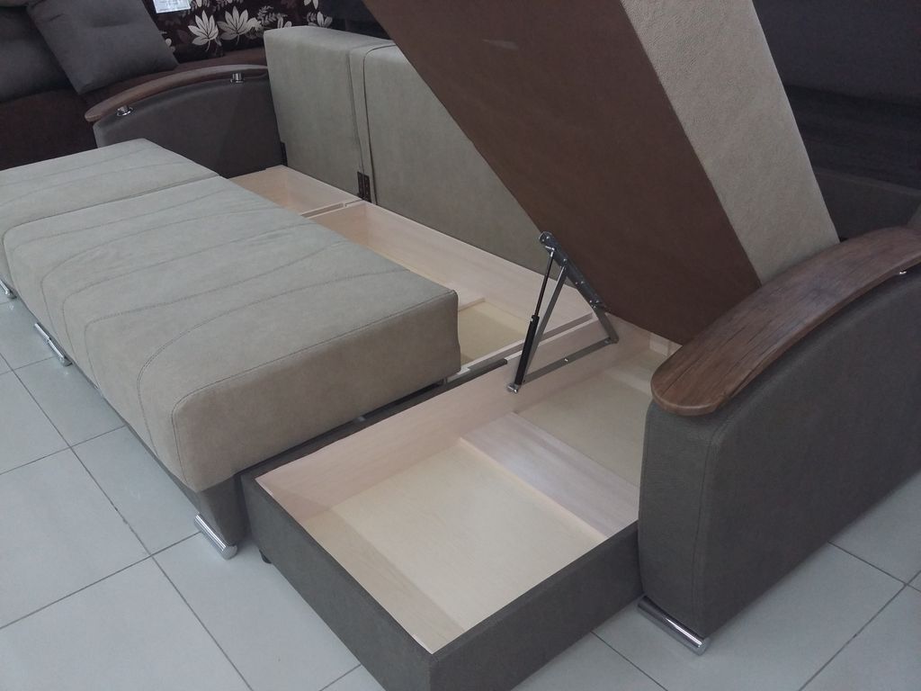 Взаимозаменяющиеся углы. Угол трансформер. Большое спальное место, ламинированный короб под белье. Механизм трансформации позволяет раскладывать диван, не повреждая поверхности пола.