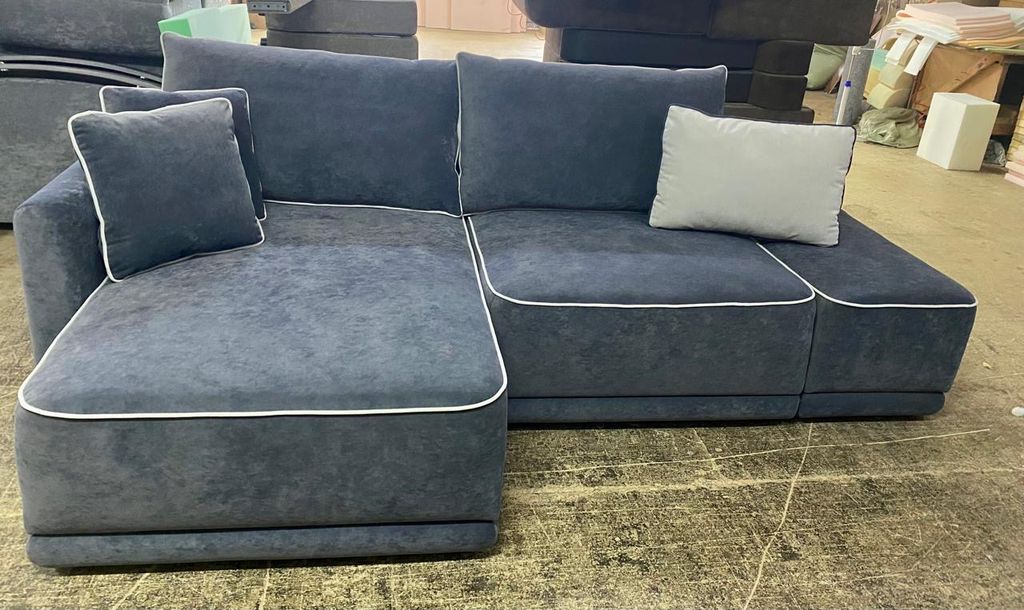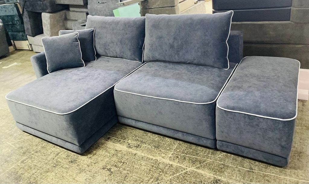 Угол трансформер. Каждая часть трансформера 1 м. Пуф 0,45 м возможен отдельно, что позволяет варьировать общие габариты дивана. Большое спальное место, ламинированные короба для хранения постельного белья. Механизм трансформации позволяет раскладывать диван, не повреждая поверхности пола.